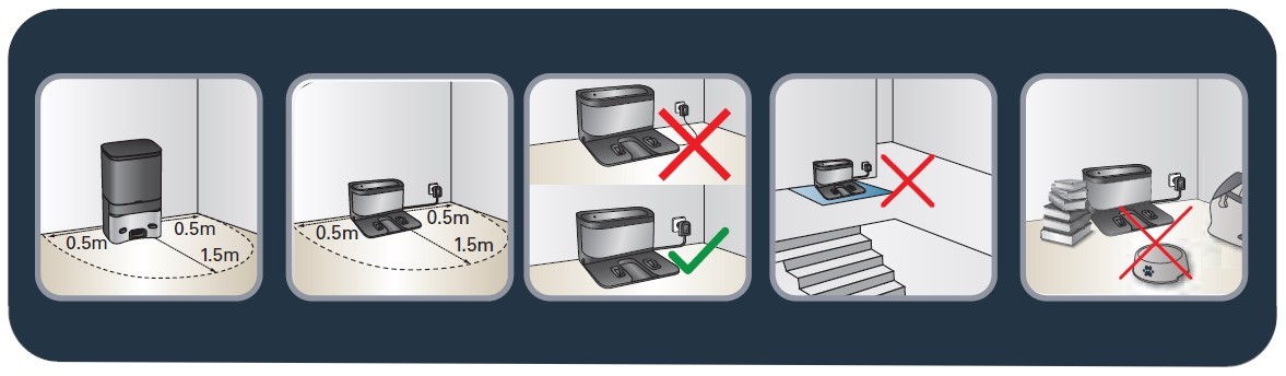 Na daném místě se nesmí nacházet žádné překážky (ani koberečky). Ponechte alespoň 1,5 metr volného prostoru nalevo a napravo od stanice základy a 2 metry volného prostoru před stanicí základny. Pokud stanici umístíte do rohu nebo pokud bude obtížné ji nalézt, robotický vysavač ji nebude moci dosáhnout.