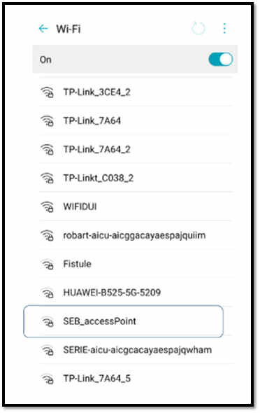 4) Přejděte na nastavení telefonu a potvrďte, že vidíte WiFi síť s názvem „SEB_accessPoint“ (snímek obrazovky umístěný níže).