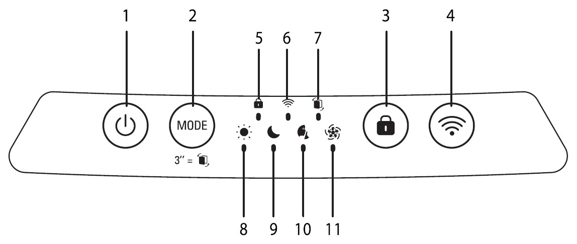 Pomocí tlačítek zobrazených v aplikaci můžete produkt zapnout/vypnout a změnit jeho režimy, intenzitu světla a oscilaci (v závislosti na modelu). - Ovládací lišta: